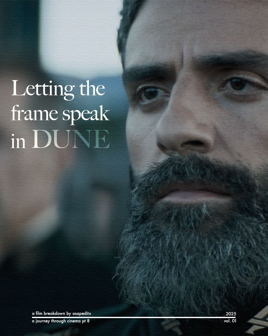 Letting the Frame Speak is a typographic and graphic study created in Adobe Illustrator that examines the filmmaking techniques of Dune. The project explores how framing, scale, and composition communicate narrative meaning, and was adapted for social media to translate cinematic restraint into a concise, shareable format.